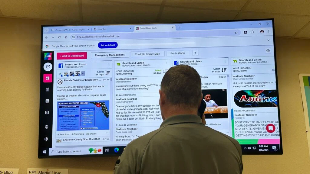 During Tropical Storm Debby, Charlotte County’s Joint Information Center (JIC) harnessed SND’s Search & Listen dashboard, projecting live social media streams directly onto EOC monitors—essentially creating a social command center. These feeds captured: