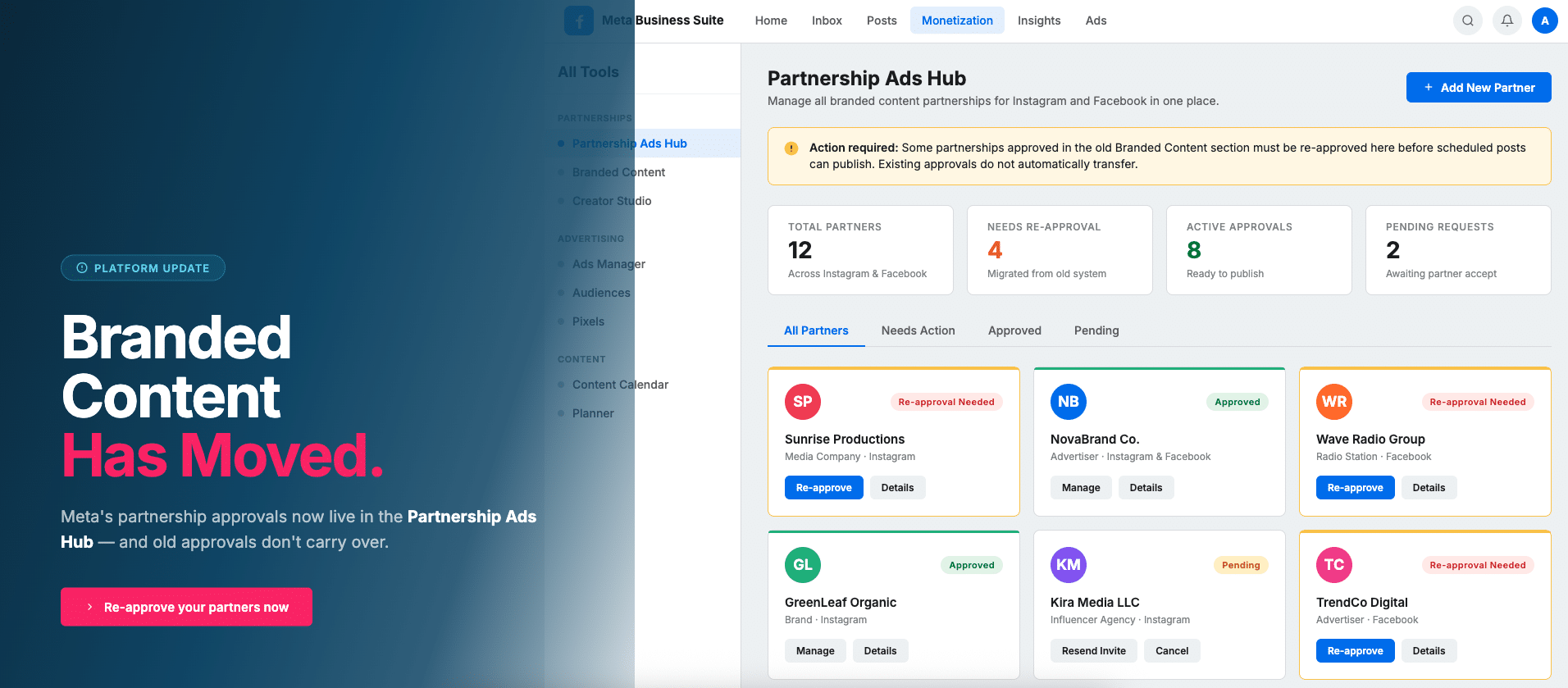 Even if you’re only posting organic branded content (not paid ads), all partnership approvals now need to happen inside Meta’s new Partnership Ads Hub. The old system is no longer the main control center, and many existing partnerships won’t work until they’re re-approved in this new location.