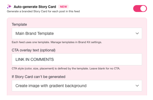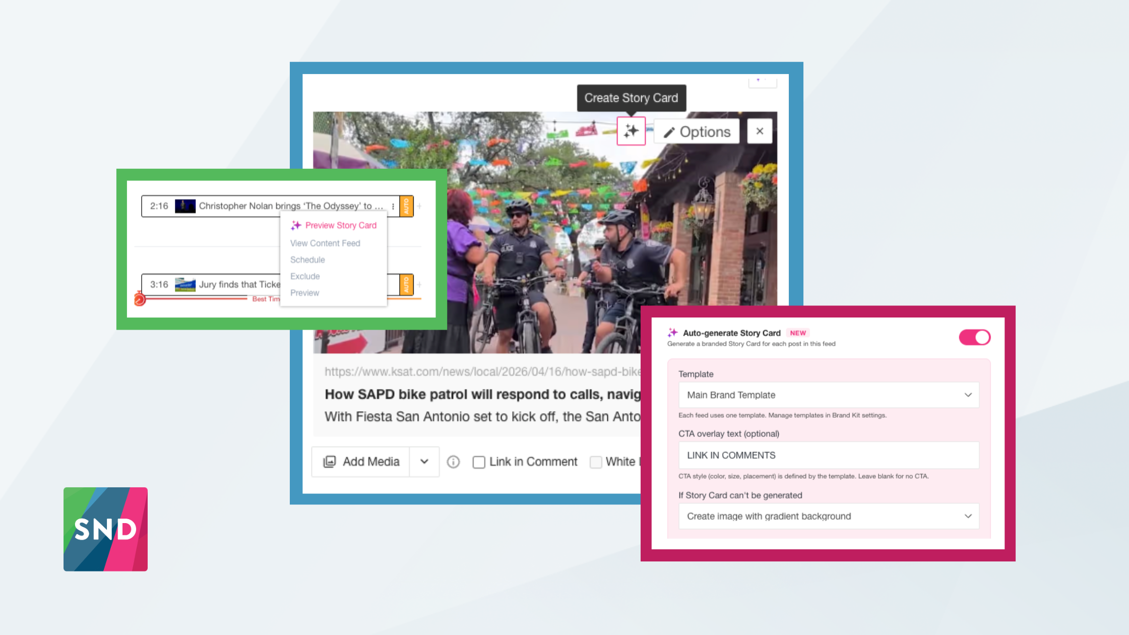 Enable Story Cards on any feed and SND automatically generates a branded graphic for every post that publishes – using the article’s image, headline, CTA, and your chosen template. Different feeds can use different templates. Configure it once, and it runs.