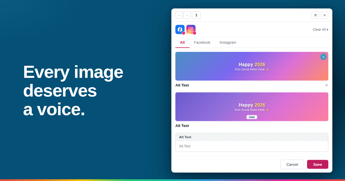 Social media moves fast, but accessibility can’t be an afterthought. Even with Social News Desk’s streamlined “All” tab workflow in Post Composer, small details – like alt text – can slip through the cracks. That’s why we’ve improved the workflow, making it simpler and faster to add alt text directly in the “All” tab, so every image in your posts is clear and understandable to everyone, including people with visual impairments.
