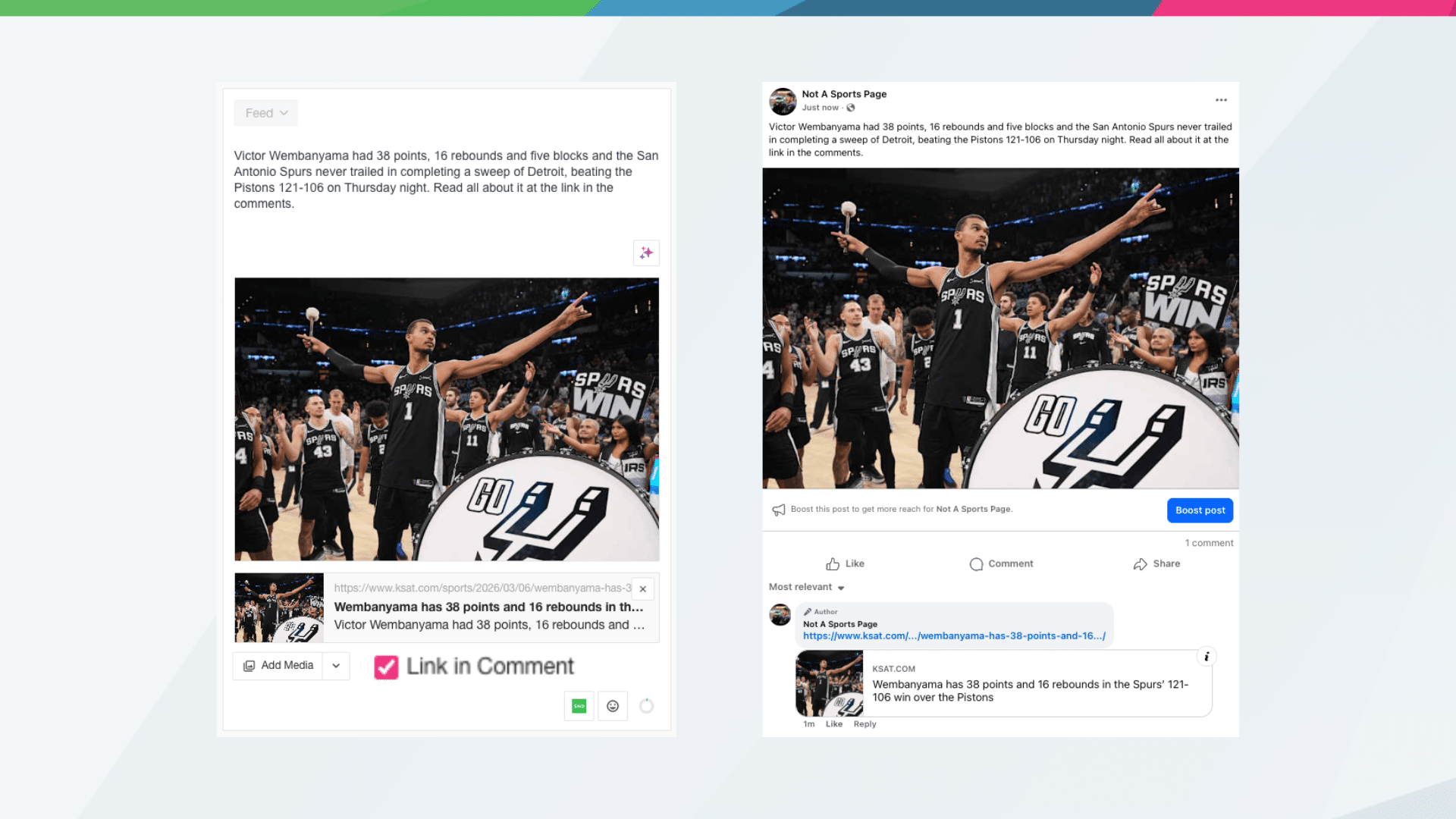 Facebook’s algorithm has long favored posts that keep users on the platform. Posts with outbound links in the body tend to get less reach than image posts or text-only posts. The Link in Comment strategy lets you have it both ways: publish a clean image post that performs well in the feed, then drop the article link into the first comment immediately after it goes live – driving traffic without sacrificing reach.
